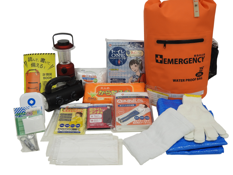 大きな災害が頻発する昨今、車載しておくと万一のときに役立つアイテムを集めたパッケージです。車内で待機をしなければいけない時、車を置いて避難所へ向かうとき、数日間家に帰れない時に役立つアイテムをセレクトし、防水リュックに詰めました。離れて暮らすご家族皆さんにもいかがでしょうか。